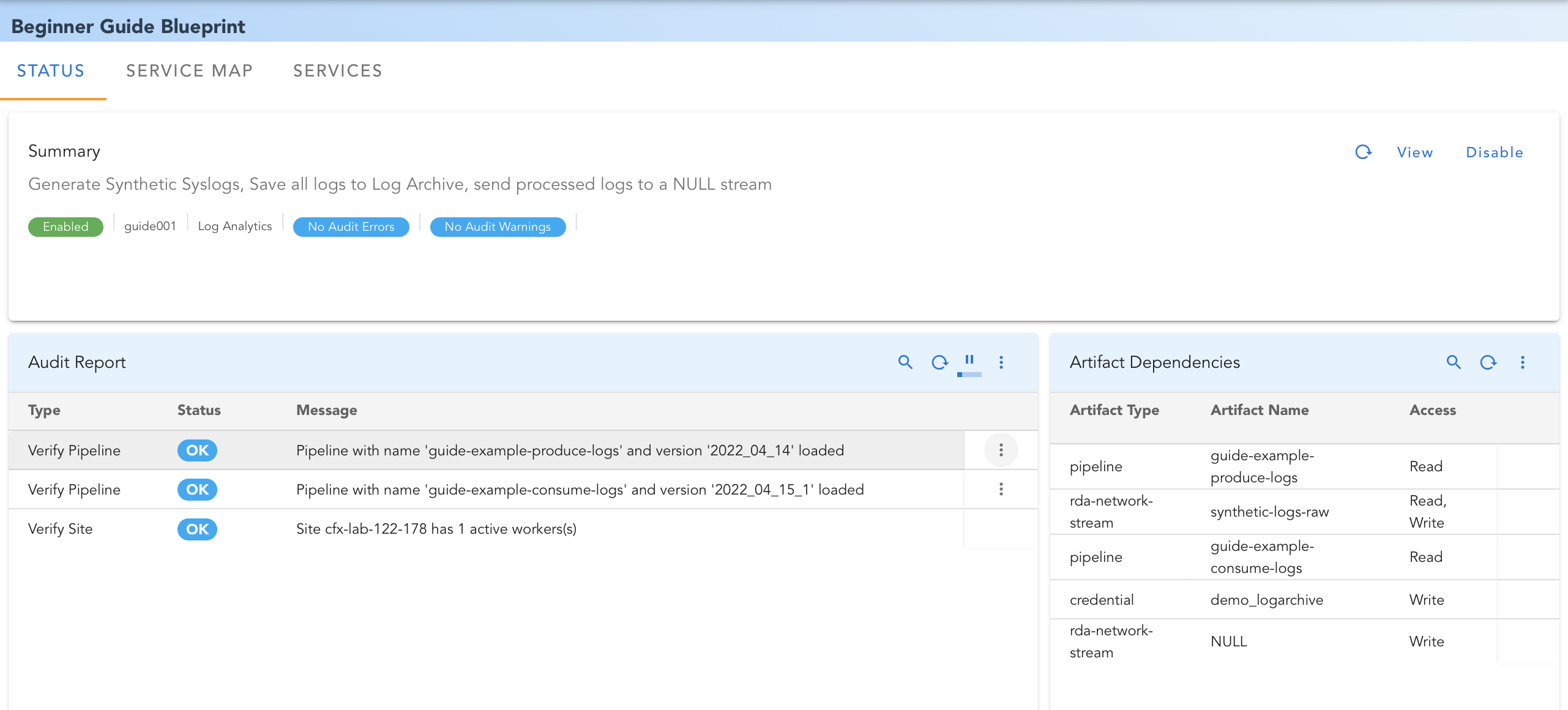 For the sake of future reference, let us save the pipeline with name guide-example-produce-logs in RDA Studio