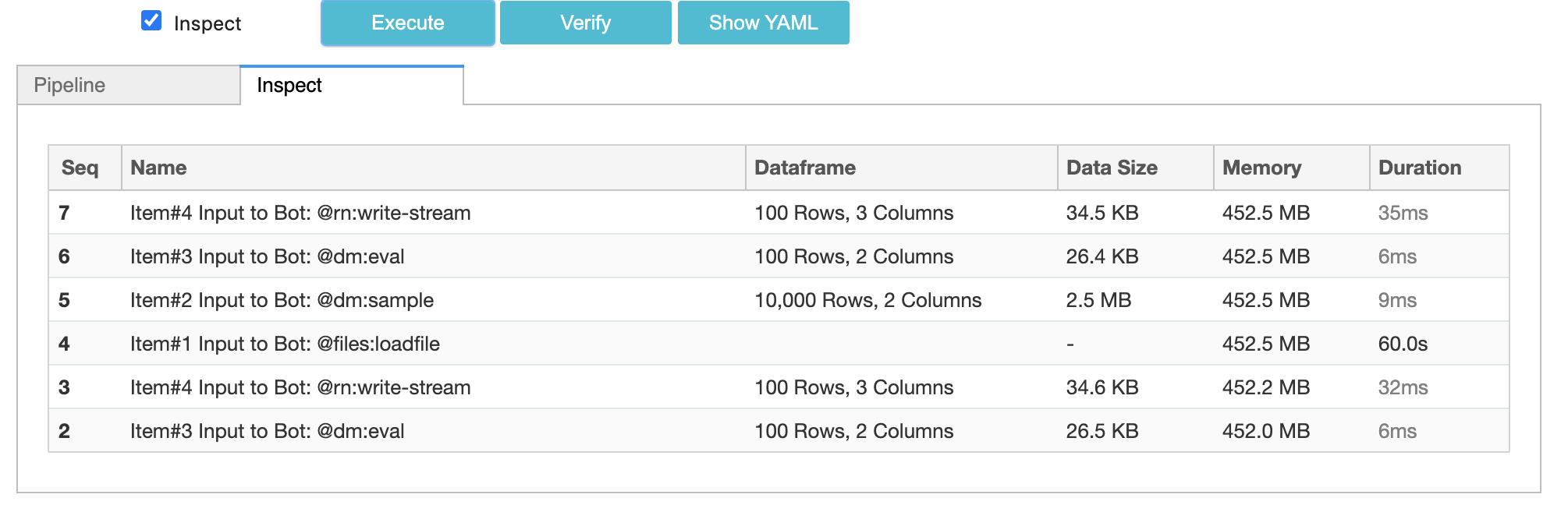 So far we have used the @files:loadfile. As you can see in the Bot documentation, it is a Source Bot. Which implies that bot produces data to be consumed by other Sink bots. In this case, loadfile bot is downloading the data from a URL and returning dataframe for further processing by other bots.