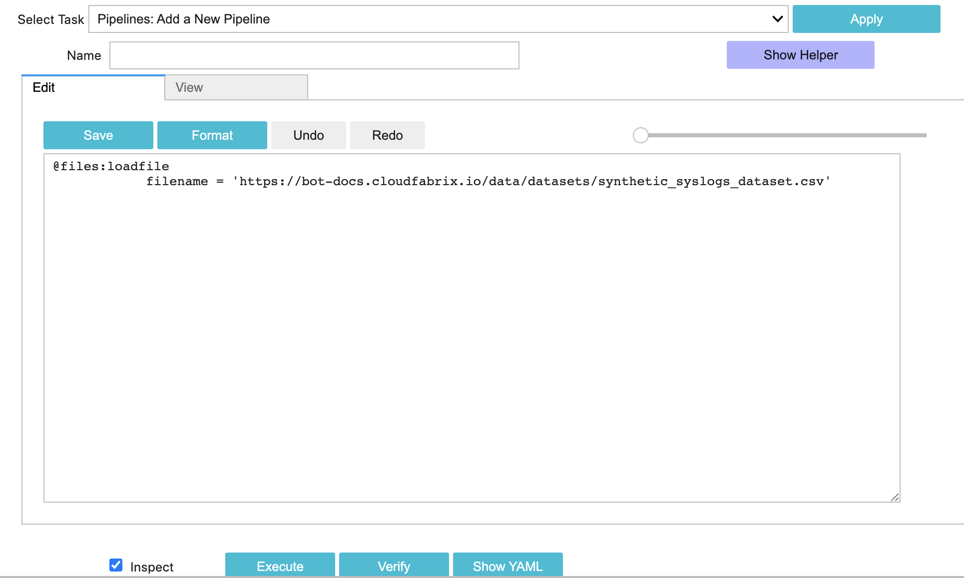 The updated pipeline now contains two blocks. First block downloads the data from a URL and saves it as in-memory dataset temp-syslogs-dataset
