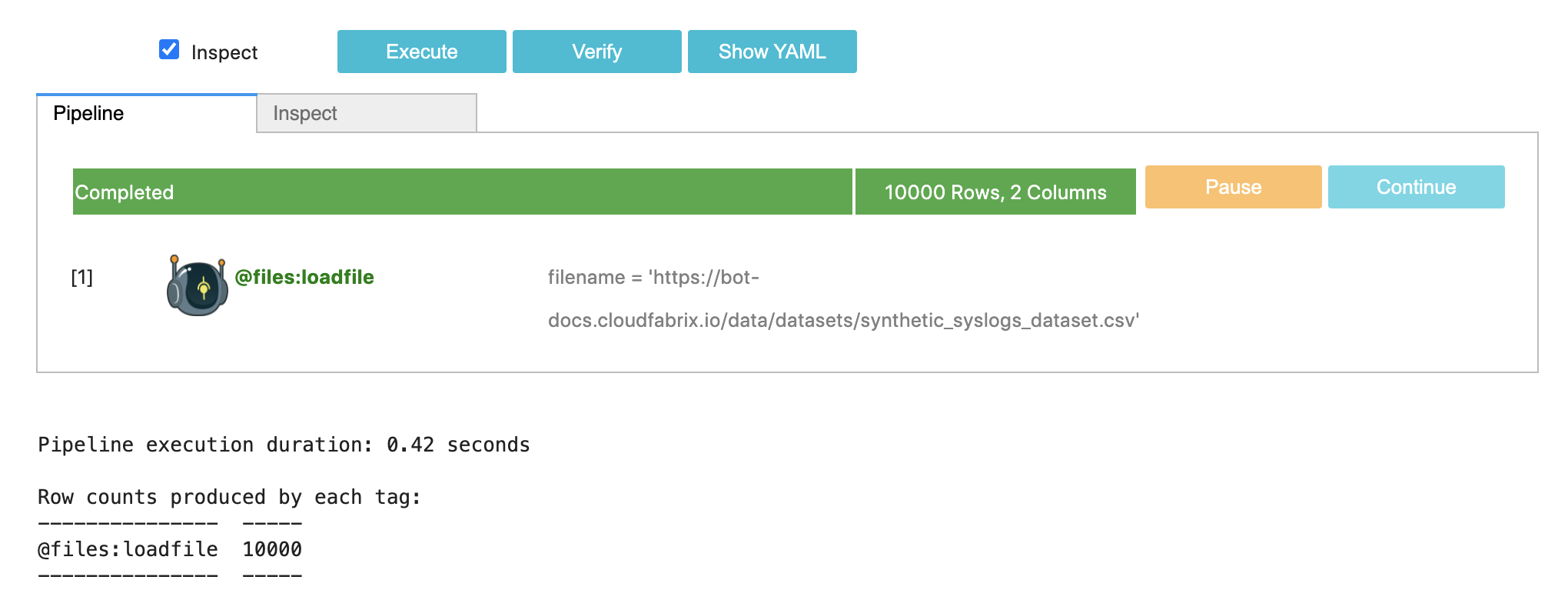 Above pipeline saves 100 randomly selected rows to the dataset with name my-generated-logs. By using the parameter append = "yes", dataset can be used as a continuously appended dataset. If the dataset name begins with temp- prefix, then dataset is only saved in-memory and is deleted once the pipeline execution completes.