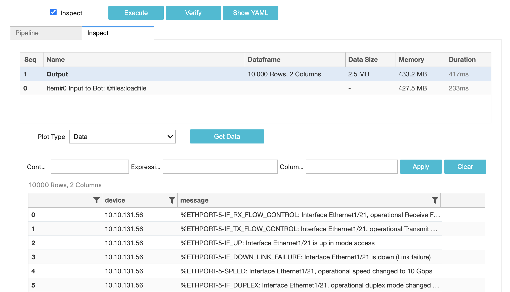 In the above pipeline we are asking to include any data that matches the specified filter criteria. In this case *dm:filter bot will filter out any rows where column device has value 10.10.131.56. This bot accepts CFXQL and refer to the link for full syntax.