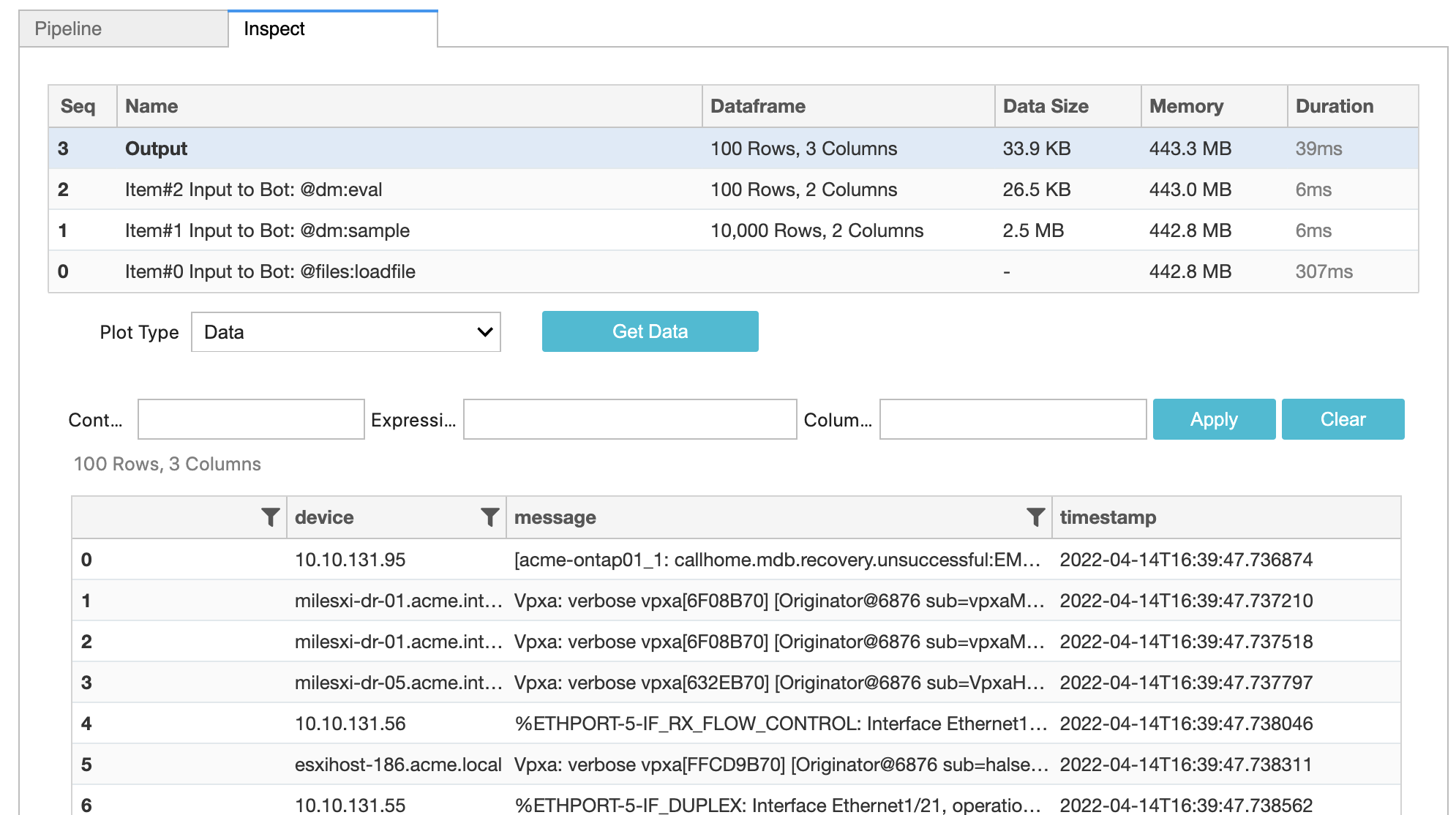 You will also see that output dataframe has just two columns: Device and Message. Let us add timestamp column using @dm:eval Sink Bot. This bot adds a new column using expressions for each row.