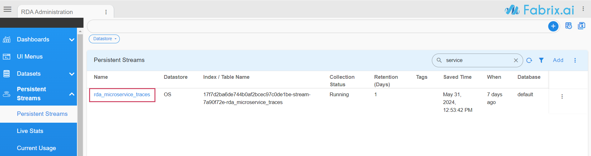 Login into RDAF UI portal and go to Main Menu --> Configuration --> RDA Administration --> Persistent Streams