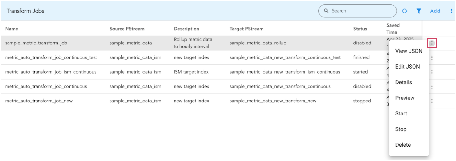 Start Initiates the transform job with this action. Newly created transform jobs are initially disabled. After reviewing the sample data via the Preview action, use this to start the job.