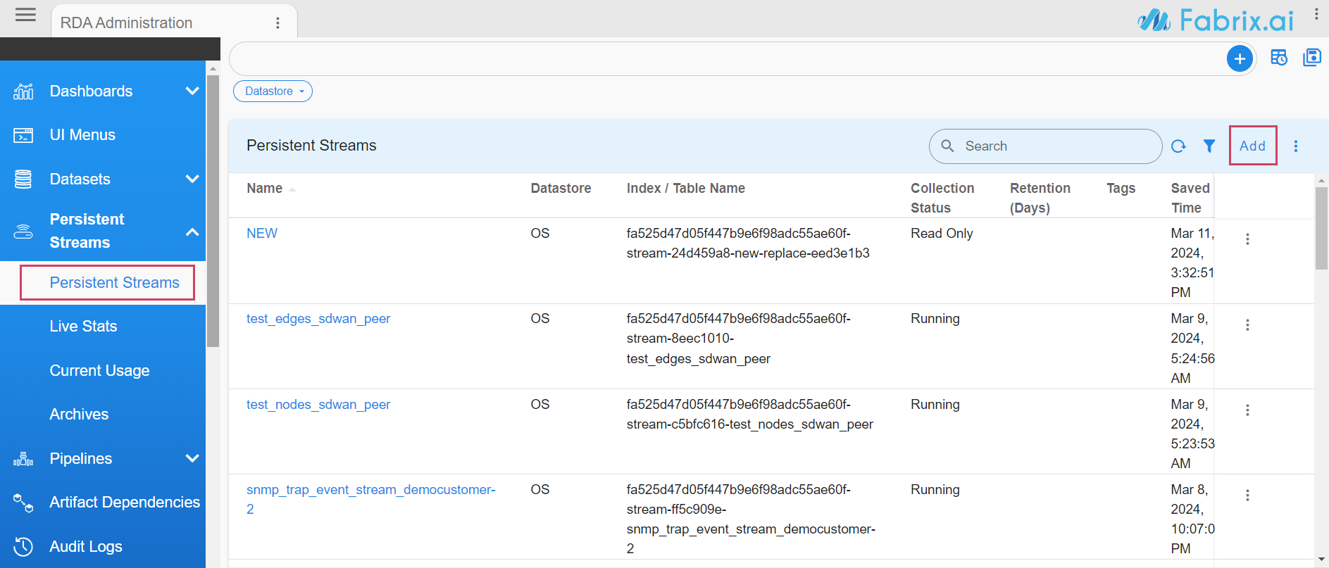 Persistent streams can be managed through rdac CLI or through RDAF UI portal. By default, RDAF's applications such as OIA (AIOps: Operations Intelligence and Analytics) and AIA (Asset Intelligence and Analytics) comes with pre-created persistent streams.