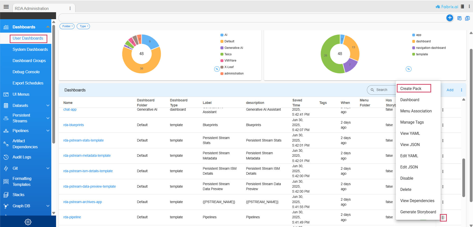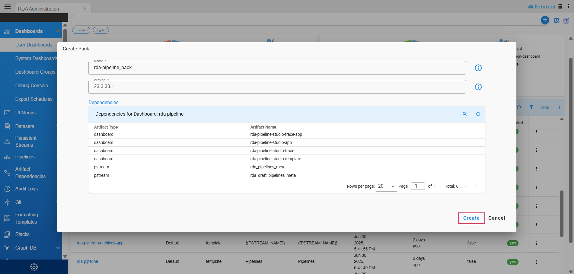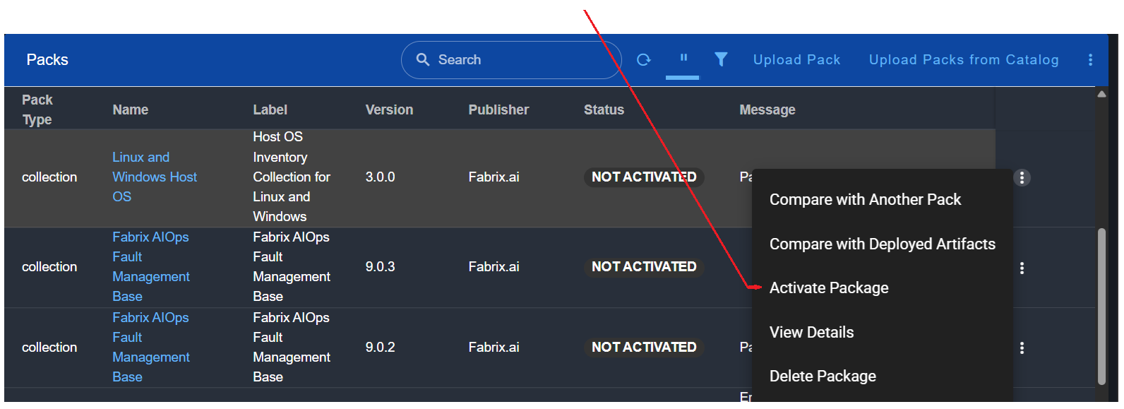 After a pack is uploaded to the RDA Fabric platform, User can view the creation_policy values set for different artifacts through the user interface. Navigate to the pack's View Details page, where you will see a comprehensive listing of all artifacts included in the pack along with their respective creation_policy values.