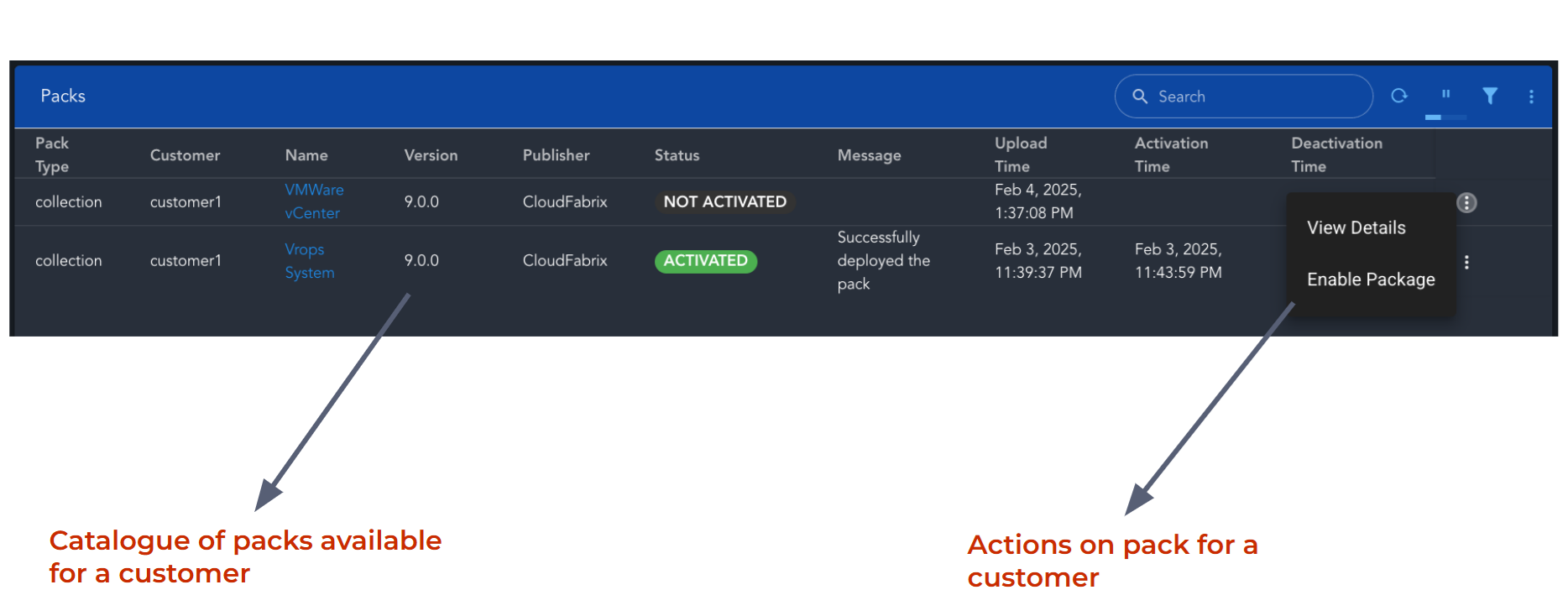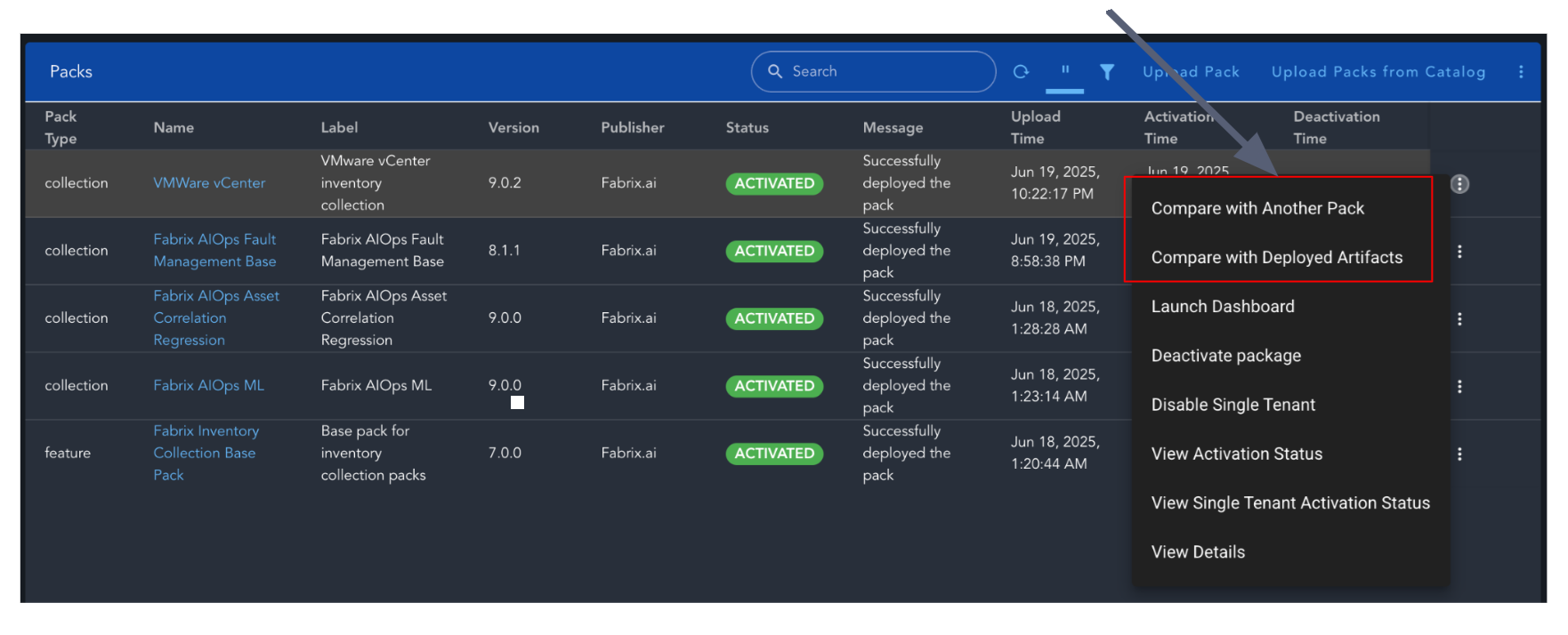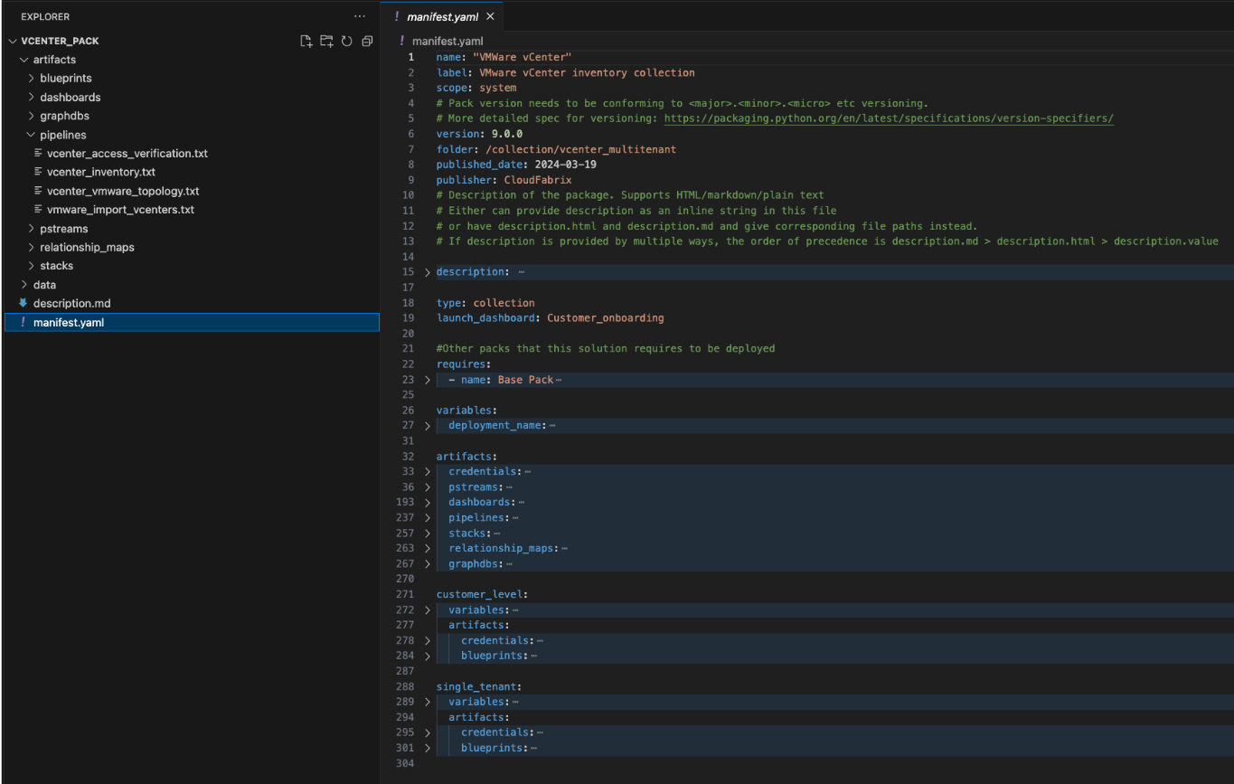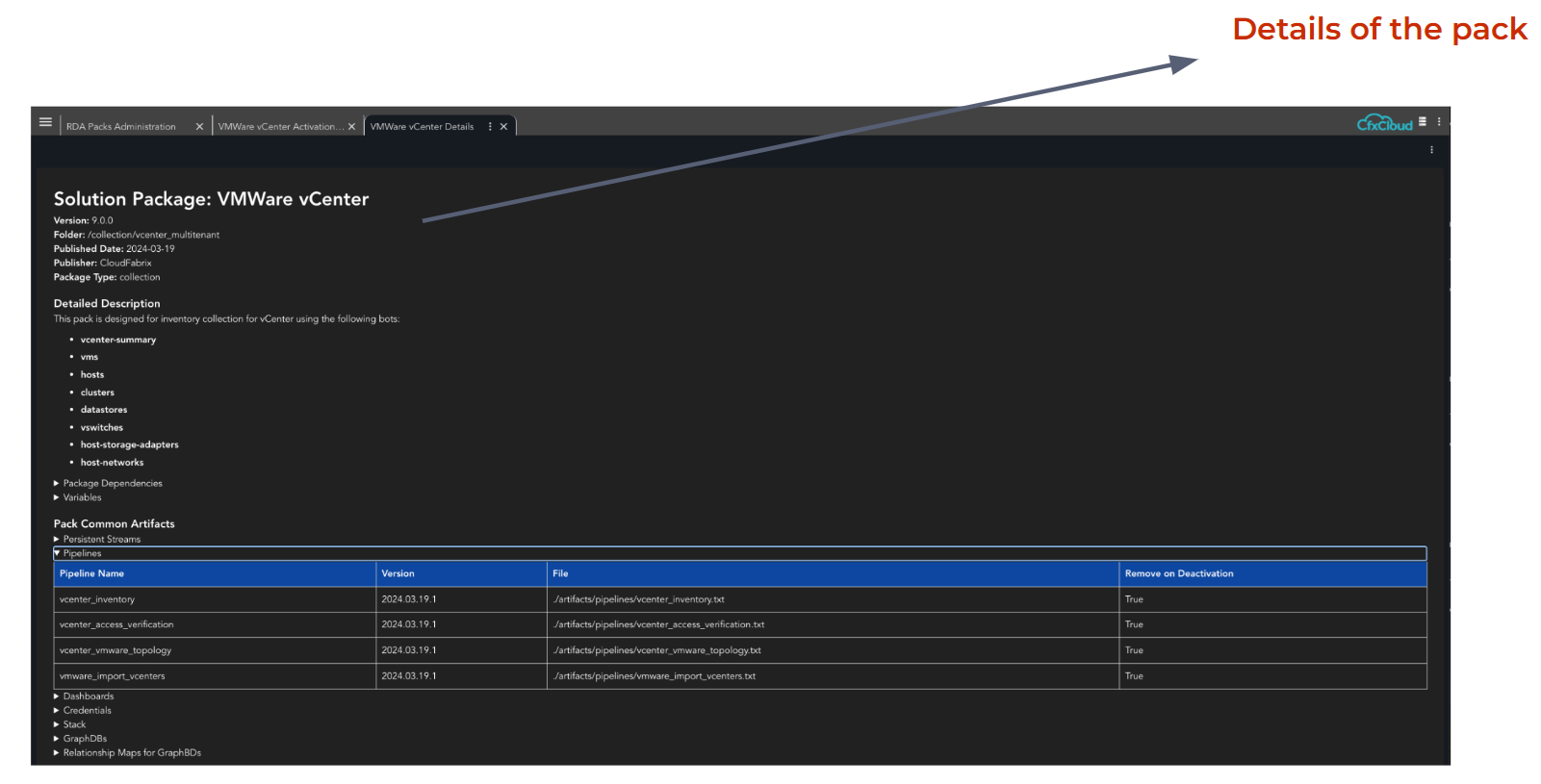 In the above given example the pack name is "VMware vCenter" version is 9.0.0 & it requires Base Pack of version >= 5.0.0 to be deployed.