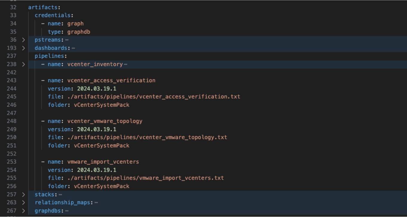 Example of a pack is vCenter Inventory which may consists of datasets, pstreams, pipelines, dashboards that are required to support the inventory collection.