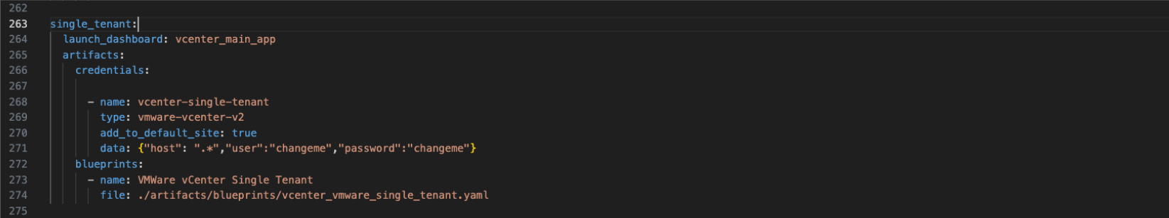 In the example shown above when the pack is enabled for single tenant, credential & blueprint will be created with names vcenter-single-tenant & vCenter Single Tenant respectively.