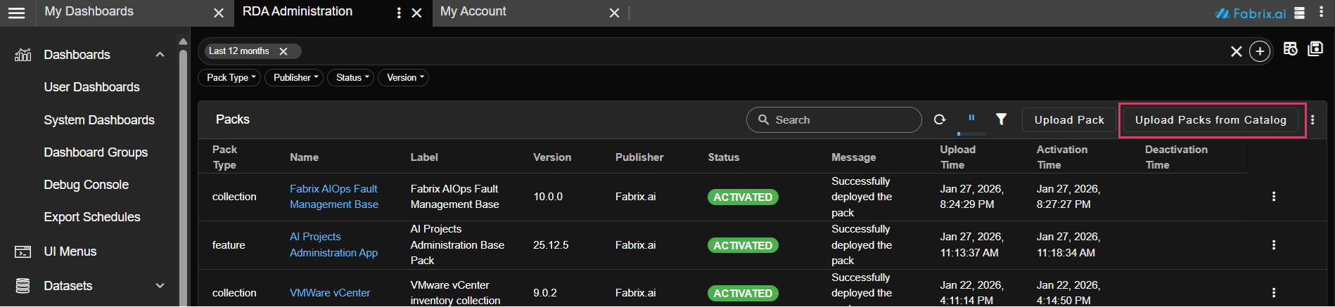 The Bundles page has been deprecated from the RDA Administration. Identified bundles have been converted to solution packs, which can now be uploaded via the “Upload from Catalog” option on the Packs page in RDA Administration.