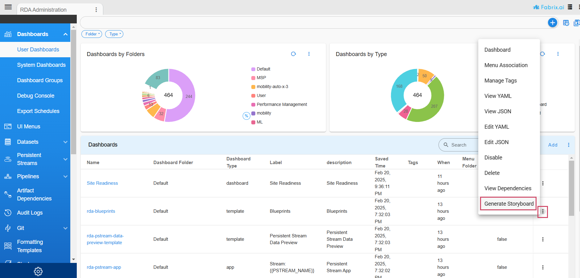 - An alternative way to transform an existing dashboard into a storyboard is to use the Generate Storyboard option from the menu.