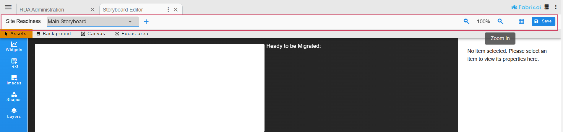 The Focus Area control tool lets users highlight a specific section of the storyboard and adjust the scale to fit it perfectly within the window width. This tool becomes available once Focus Areas are added to the storyboard.