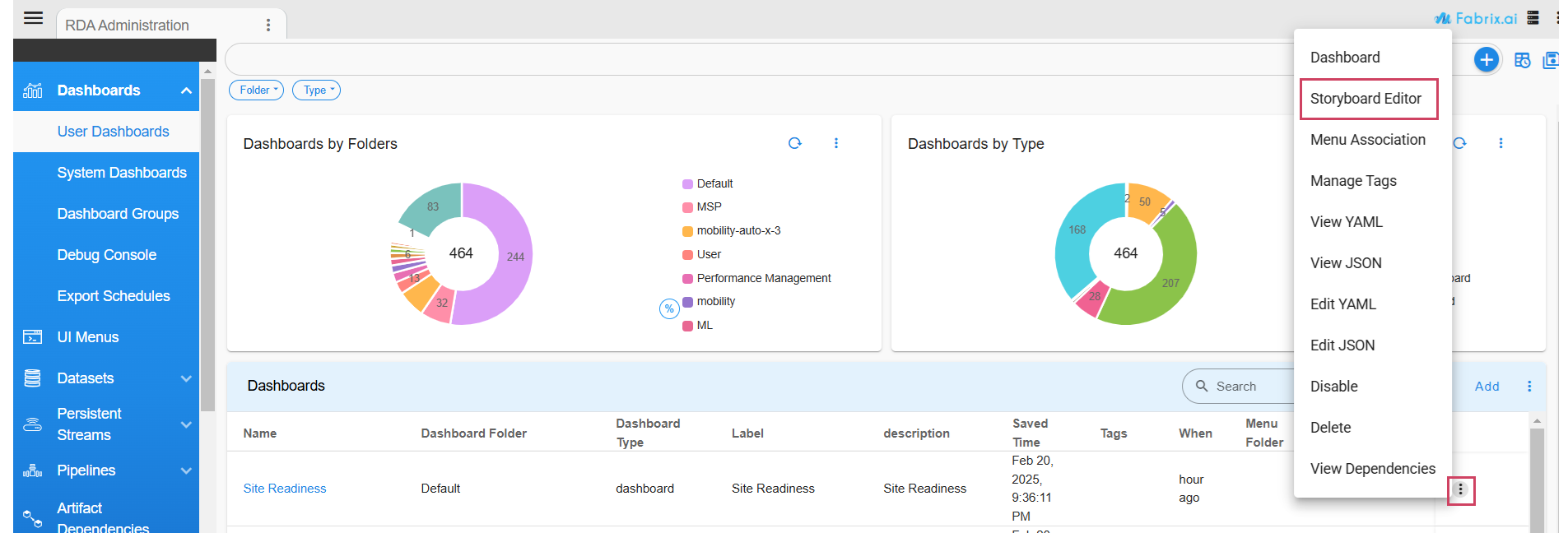- After enabling the storyboard feature for a dashboard, the Storyboard Editor menu becomes available. To open it, just click the action menu.