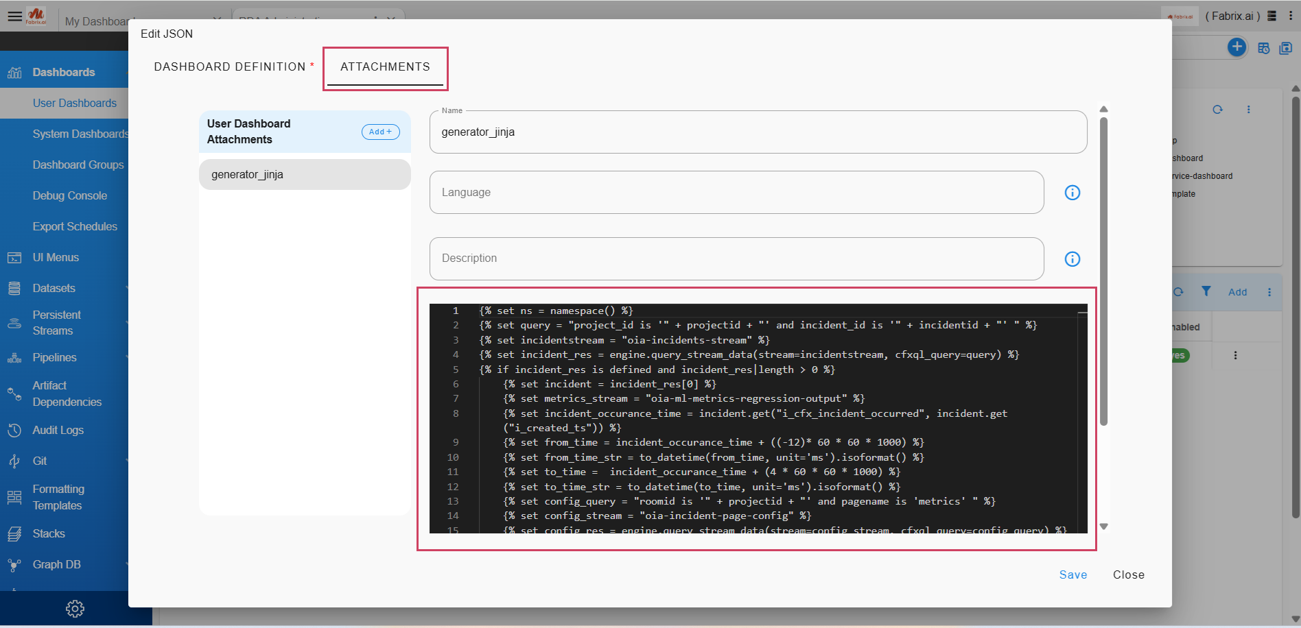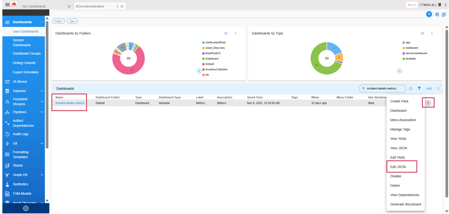 3. In the search box of the tabular report, search for incident-details-metrics. Click on the three dots to open the menu for the table row where the incident-details-metrics dashboard is listed, then click on Edit JSON. Click on Attachments and replace the existing text with the text provided in the link above.