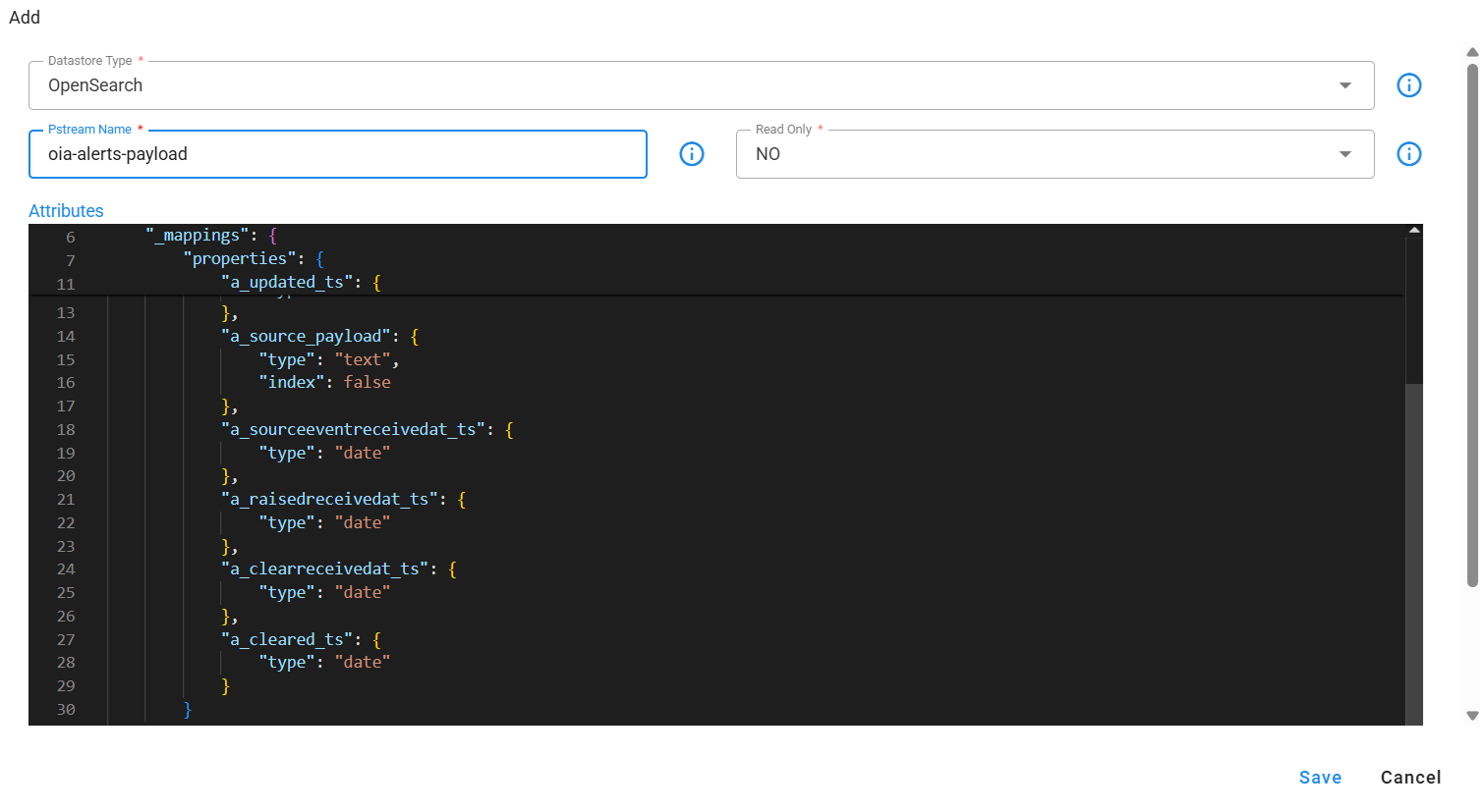 oia-alerts-payloadpstream is not found, create it using the definition provided below. To create a new pstream, go to Main Menu --> Configuration --> RDA Administration --> Persistent Streams --> Add using the appropriate definition.